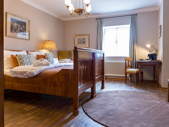 Each of the 32 guestrooms is decorated with genuine Biedermeier furnishings. Walls, fabrics and carpets are harmoniously coordinated in the classic, friendly colours from the Biedermeier period, lime green, light blue, pale purple and sunny yellow.